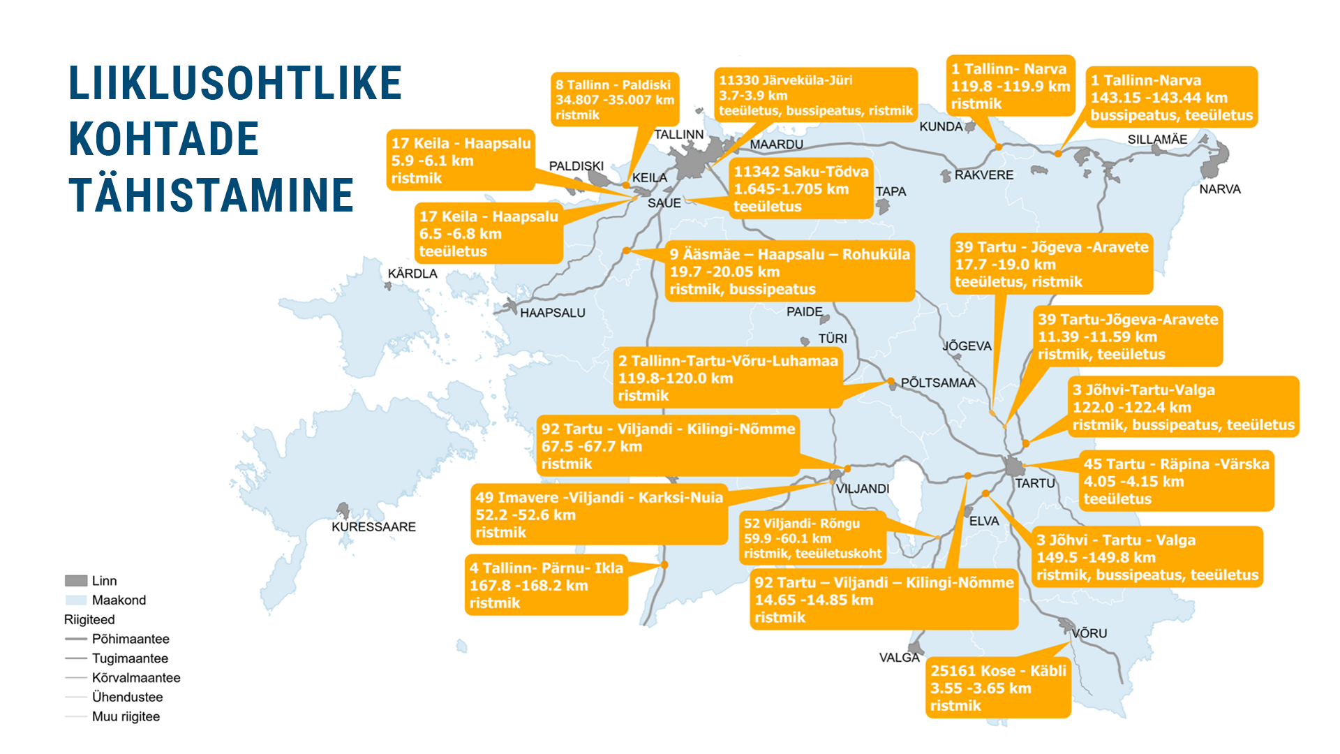 Valikusse jõudis 16 ristmikku ja 4 teeületuskohta. Umbes pooltes neist alandatakse ka lubatud sõidukiirust. „Tähistame kohad, kus on toimunud rohkem liiklusõnnetusi või kus risk nende kordumiseks on suur,“ selgitas Transpordiameti liiklusohtlike kohtade ekspert Janno Vilberg. „Hoiatusmärgid ei ole pelgalt visuaalne element – nende eesmärk on panna juht oma kiirust kohandama ja ümbrust teadlikumalt jälgima, mis omakorda aitab õnnetusi ennetada.“
