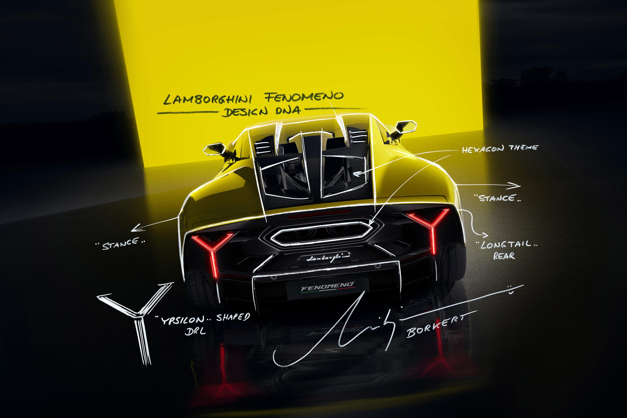 Disainilt järgib Fenomeno Lamborghini traditsiooni: teravad nurgad, Y-kujulised valguselemendid, rohkelt süsinikkiudu ja kere, mis meenutab pigem kosmosesondi kui autot. Longtail-proportsioonid, Omega-kujuline tagatiib ja „sõõrikutehase“ stiilis veljed annavad põhjuse uskuda, et auto kuulub pigem garaaži kui parklasse. Interjöör on minimalistlik, täis ekraane ja süsinikkiudu.
