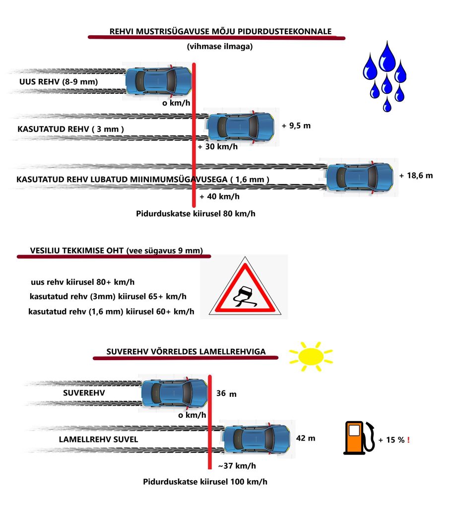 👉 Üldine soovitus on mõelda uutele rehvidele, kui rehvimustri sügavus on 3 mm või väiksem. Kohas, kus uute rehvidega sõiduk on vihmase ilmaga peatunud, on 3 mm mustrisügavusega rehvidega sõiduki kiirus samades teeoludes veel 30+ km/h.