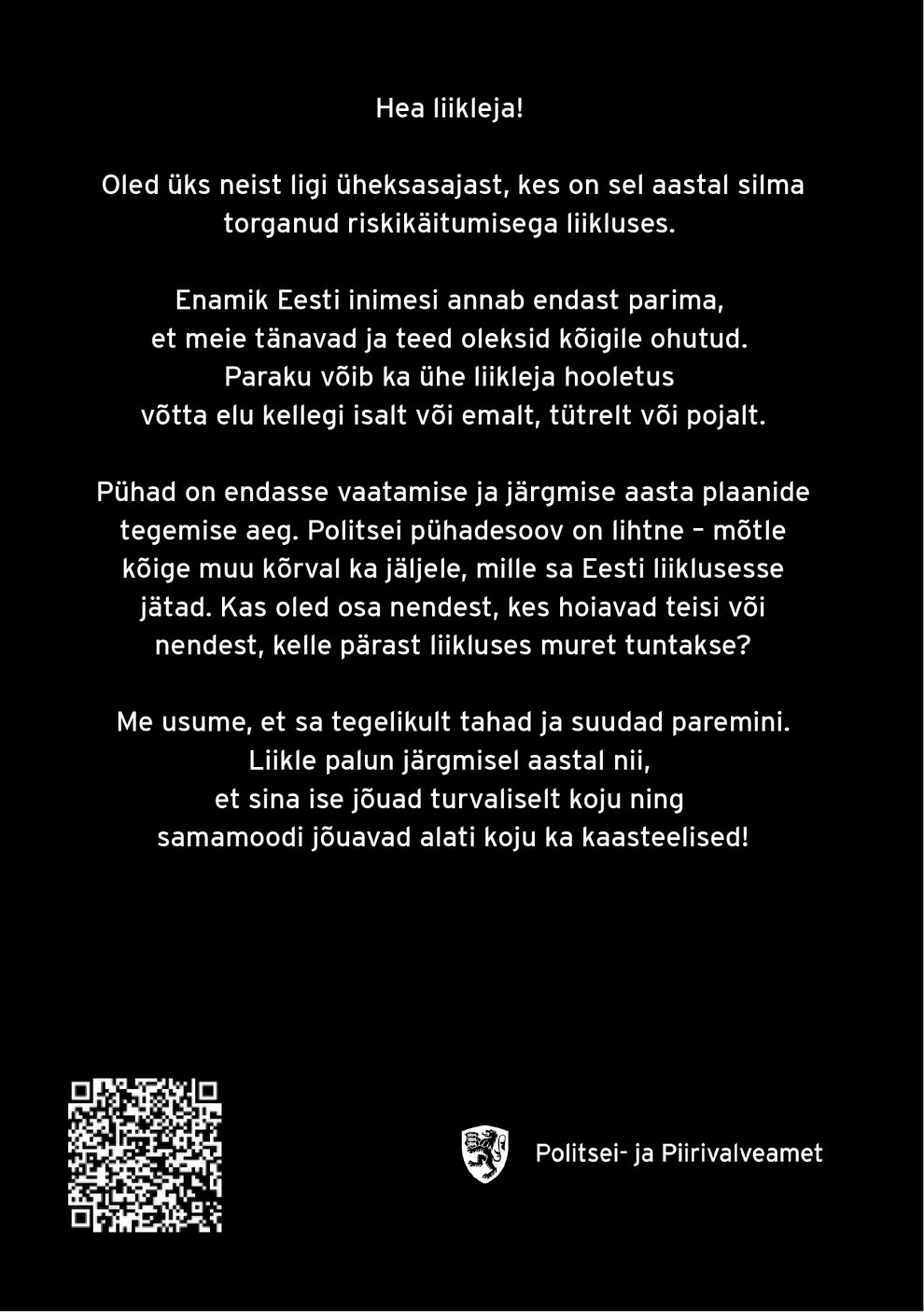 Politsei- ja Piirivalveamet (PPA) saatis ka tänavu teele kurikuulsad mustad jõulukaardid – tähelepanuavaldus neile liiklejatele, kes on aasta jooksul politseipatrullidele kõige sagedamini silma jäänud. Tegemist pole jõulutervitusega heas mõttes, vaid kainestava meeldetuletusega, et liiklusseadus ei ole soovituslik kirjandus.