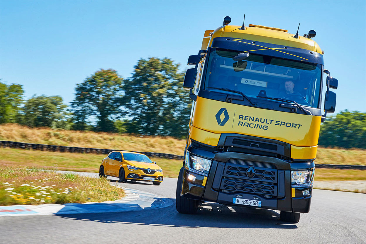 Глядя на «драйверскую» внешность грузовика на изображениях, можно подумать, что французам стало не хватать «заряженных» хетчбэков и спорткаров, поэтому они переключились на грузовой автопром. Но это не так. На самом деле перед нами специальная серия седельного тягача T-High Renault Sport Racing, получившая яркую окраску в фирменной спортивной стилистике бренда.